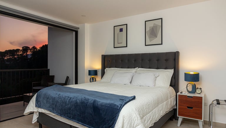 Enjoy a room with a panoramic window that offers impressive views of San Salvador, equipped for your comfort.
